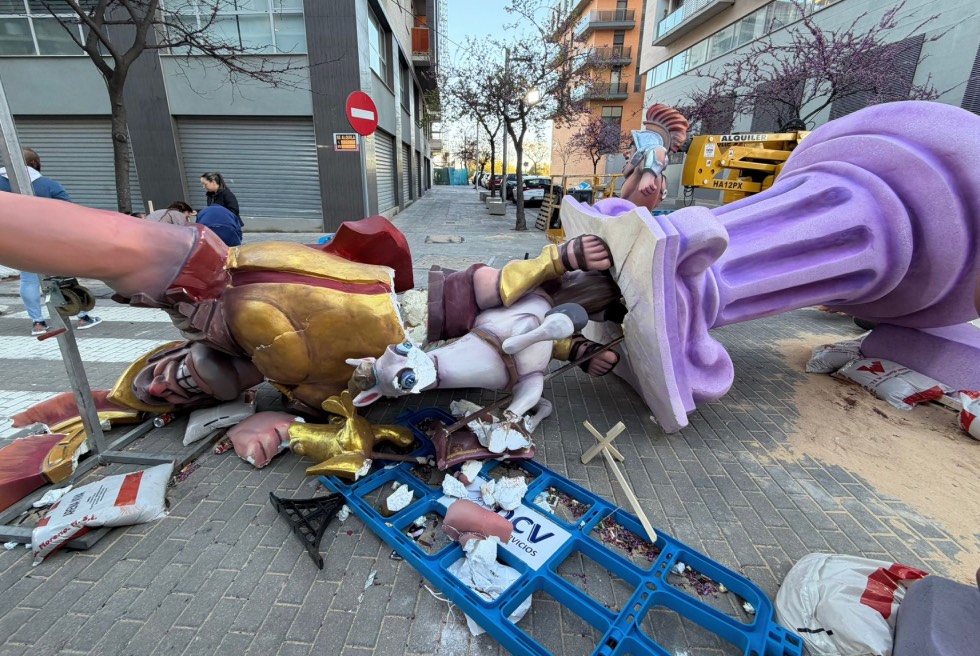Les fortes ratxes de vent registrades este dissabte a Torrent, en una jornada amb alerta groga, han provocat la caiguda del remat principal de la falla de la comissió Escultor Vicente Pallardó, situada al Parc Central.